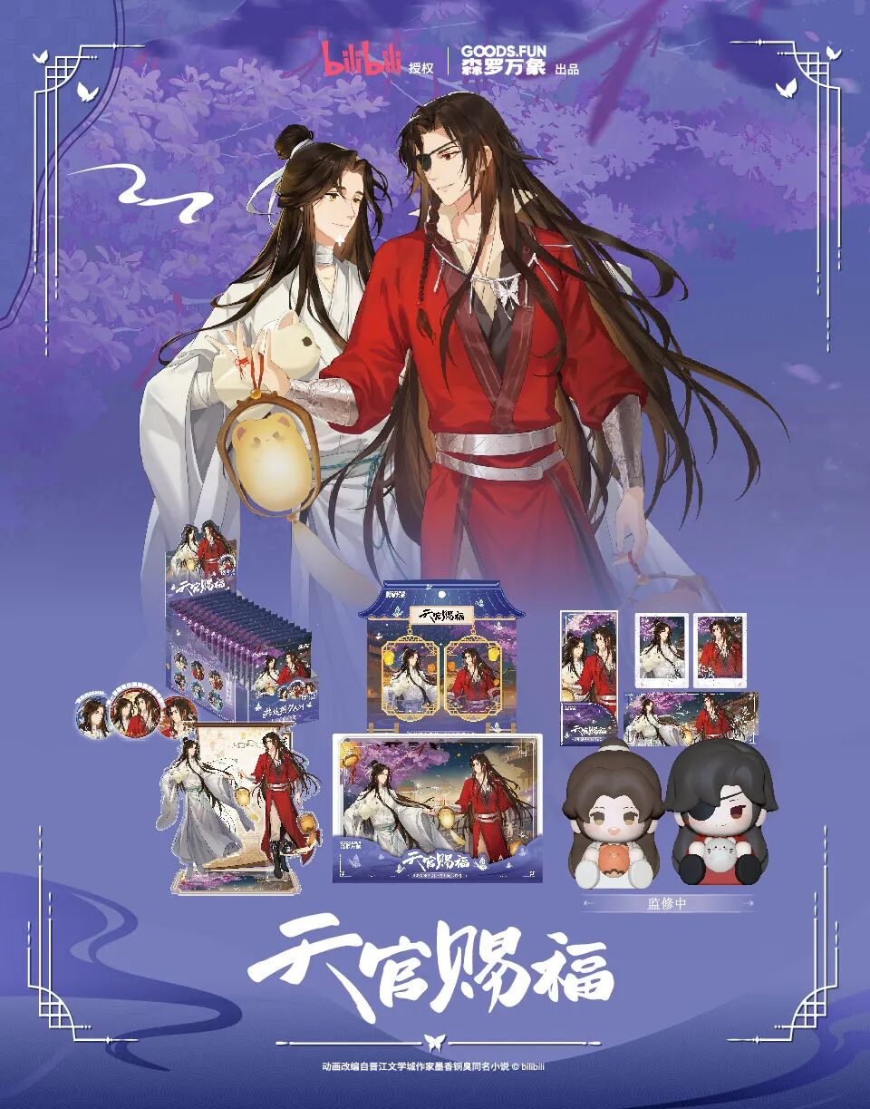 超人气国漫IP《天官赐福》共赴朝夕系列通贩周边也即将推出,产品涵盖了徽章盲包、镭射票套装、双闪色纸、亚克力立牌等丰富的产品品类。每款周边皆以匠心独运,融合IP精髓,在流星灯火间尽显古风雅韵和深情厚意。